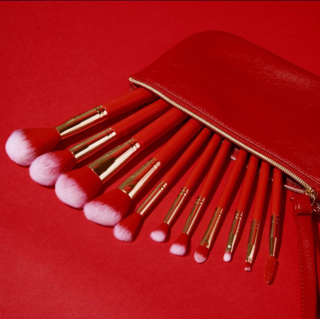 (رنگبندی ؛ قرمز با دستهای چوبی ست 12 تایی براش bh cosmetics تراکمشون فوق العاده س و به جرات میتونم 1_کاملترن و تراکمشون نسبت به همه براشامون بیشتره 2_ دوتا کیف خیلی ناز دارههه