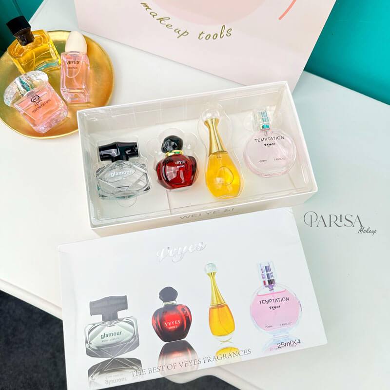 پک ادکلن زنانه veyes: 1 ادکلن glamour ( تلخ) 2 ادکلن essence (شیرین) 3 ادکلن جادور (خنک شیرین ملایم) 4 ادکلن TEMPTATION(شیرین و ملایم) • ماندگاری و پخش بوی عالی و بالا • دارای رایحه های معروف دنیا • حجم هرکدام از ادکلن ها 25 میل(4×25)